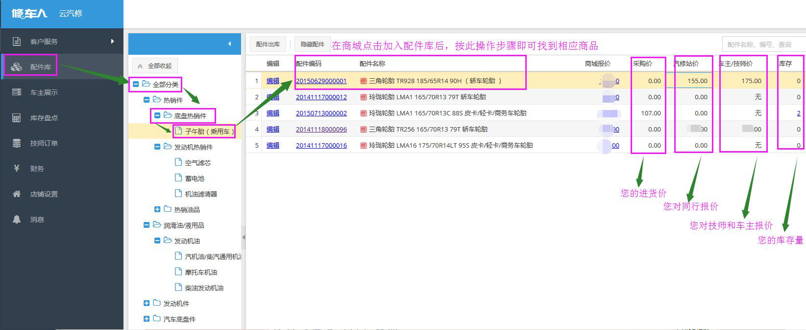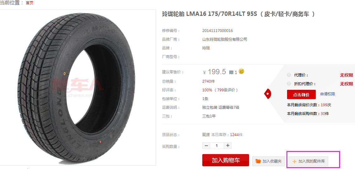 在商城搜索出您的专营商品,点击【加入我的配件库】按钮,商品就会添加到您的云汽修配件库内。