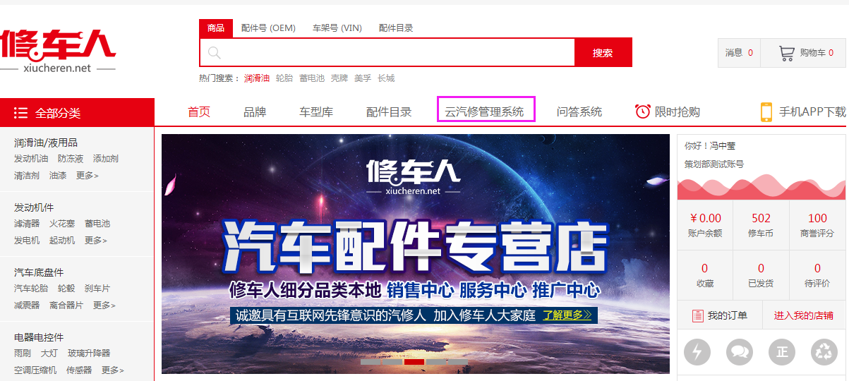 1、商城首页,点击【云汽修】进入店铺管理界面.