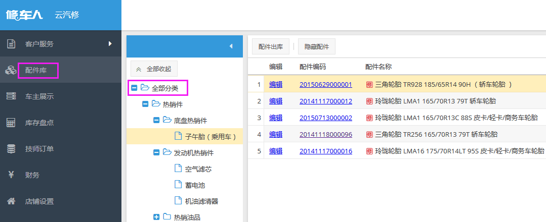 2、点击【配件库】按钮,通过分类选择,查看相应的商品.